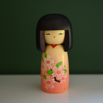 בובת קוקשי יפנית מקורית חתומה. סגנון יצירתי,  קימונו מעוטר פרחים כתום/ורד. עבודת יד, גובה 16 ס”מ.