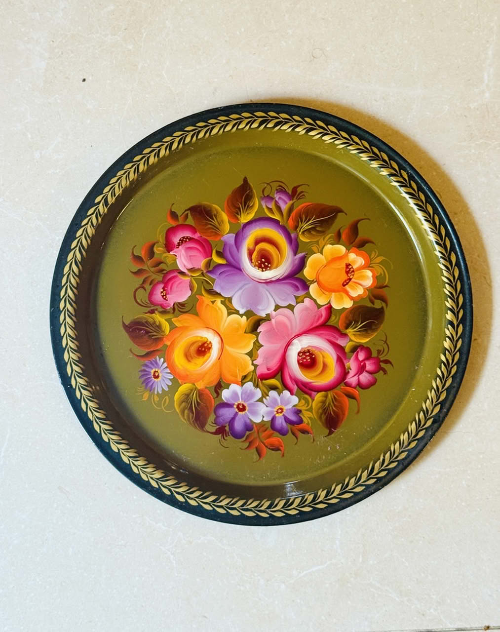מגש מתכת וינטאגי רוסי קוטר 33 מצב מעולה מתאים להגשה ולדקורציה תתום וינטאגי רוסי שנות ה60 ציור יד