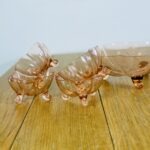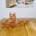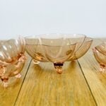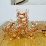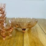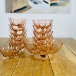 סט ורוד גדול  להגשה צרפתי זכוכית ורודה סט גדול ומרשים הסט כולל —- 12 קעריות עם הרגליים  וקערה סלט  מידות — קערה לפירות או סלט – קוטר 19 גובה 9 קעריות קטנות גובה 6 קוטר 10 13 חלקים מצב מושלם