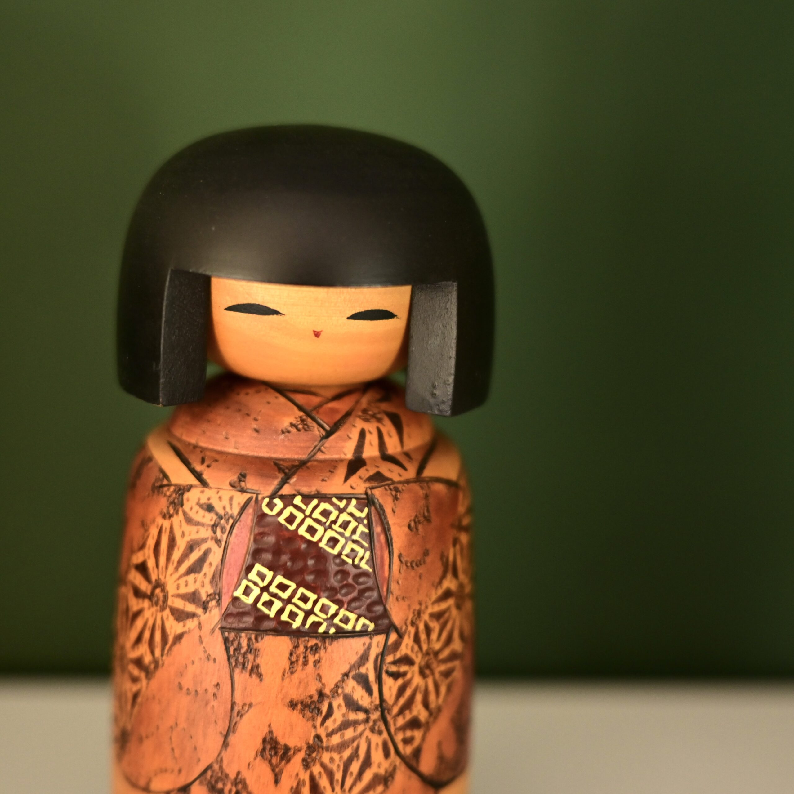 בובת קוקשי יפנית מקורית חתומה, עבודת עץ מיוחדת. סגנון יצירתי, קימונו בגוונים חומים כתומים. גובה 20 סמ.